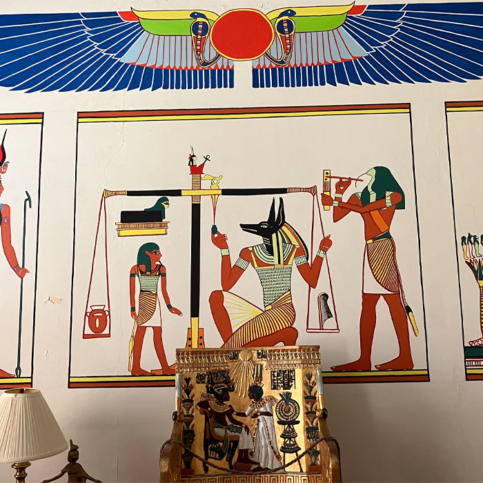 With a duplicate of King Tut’s throne chair and murals painted by Bob Hieronimus in 1970, this room is maintained as a healing meditation space for individuals who wish to reserve it. Viewing and client use is available during office hours only and by appointment.